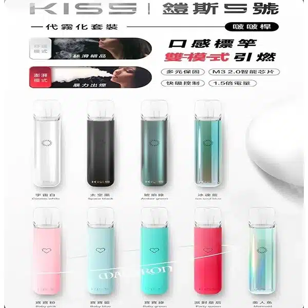 KISS 5 鎧斯5號可以通用電子煙煙彈:SP2S * ILIA * YK1 * TOLETROY * NTONE * CYONO *Kiss主機以其時尚多色選擇和實用的兩段式火力調節功能受到用戶喜愛。便捷的操作和Type-C快速充電介面確保了優質的吸煙體驗。一款結合時尚與實用的理想電子煙 霧化機。